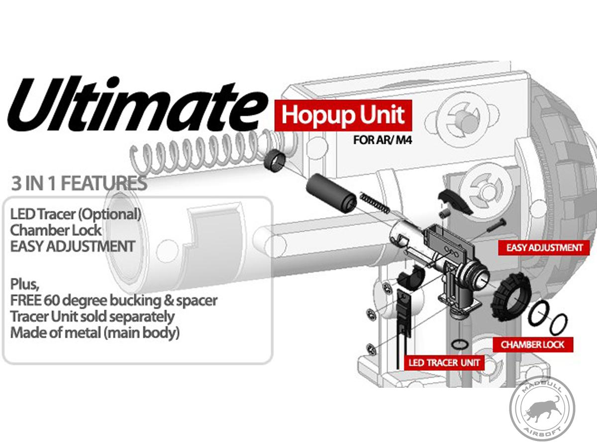 Compatible with all Marui compatible M4 series Airsoft AEG. The Ultimate Hopup Unit designed by MadBull Parts and Materials: Metal body, includes a famous MadBull blue bucking (60 degree) Tracer unit is optional. Features: (1) The LED Tracer Unit: You can buy it separately and attached to the Hopup unit. Use your AEG battery and connect to your Tracer Unit. The LED can brighten the tracer BB when BBs are in the chamber. (2) Chamber Lock: Designed by Brian Holt. With this new hop up design you will not have to worry about losing and dropping several bb??s with a magazine change. This new design provides you with a way to keep bb??s in your AEG and ready to use and not on the floor and even better it stabilizes the top of the magazine to ensure a secure and flawless feed of bb??s into the AEG. CAUTION: This hop up unit is designed for the experienced and responsible Airsoft player. With the magazine removed the AEG is still able to fire several BBs. Always wear safety goggles and treat all Airsoft weapons as if they were loaded. (3) Easy Adjustment Wheel device: Use TM G36 style adjustment device and apply on the M4/AR unit. - Full Metal Housing for maximum durability. - Hopup rubber packing included. Fits all M4 hopup rubbers. - Adjustable hopup dial. - Fits all metal bodies. (Exclude KWA metal body). Compatibility:Matrix, Dboy, Echo1, JG, Classic Army, G&P, SRC, AGM, Tokyo Marui, VFC and other m4 / M16 series Airsoft AEG. Note: This product will work with plastic body AEGs however some modification is required. Professional installation is highly recommended.